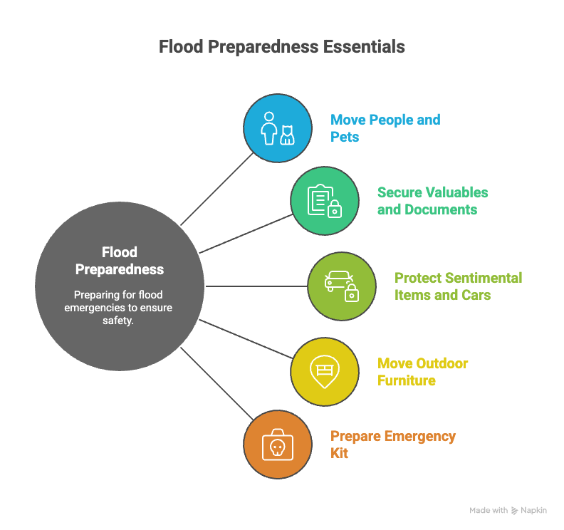 Your first priority is always safety for everyone in your home. Move family members and pets to the highest floor or a safe place nearby. Next, move valuables and important documents upstairs. Protect sentimental items and cars when facing Flood Warnings UK. Move outdoor furniture or heavy items that might float away.